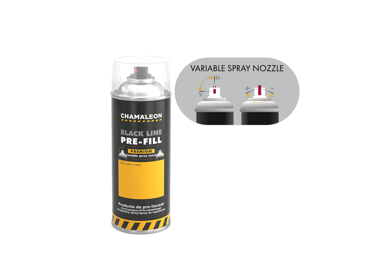 Pre-fill premium is a pre-filled can with propellant gases and solvent (300 ml) that can be filled with 1K solvent-based basecoats (100 ml) using special equipment